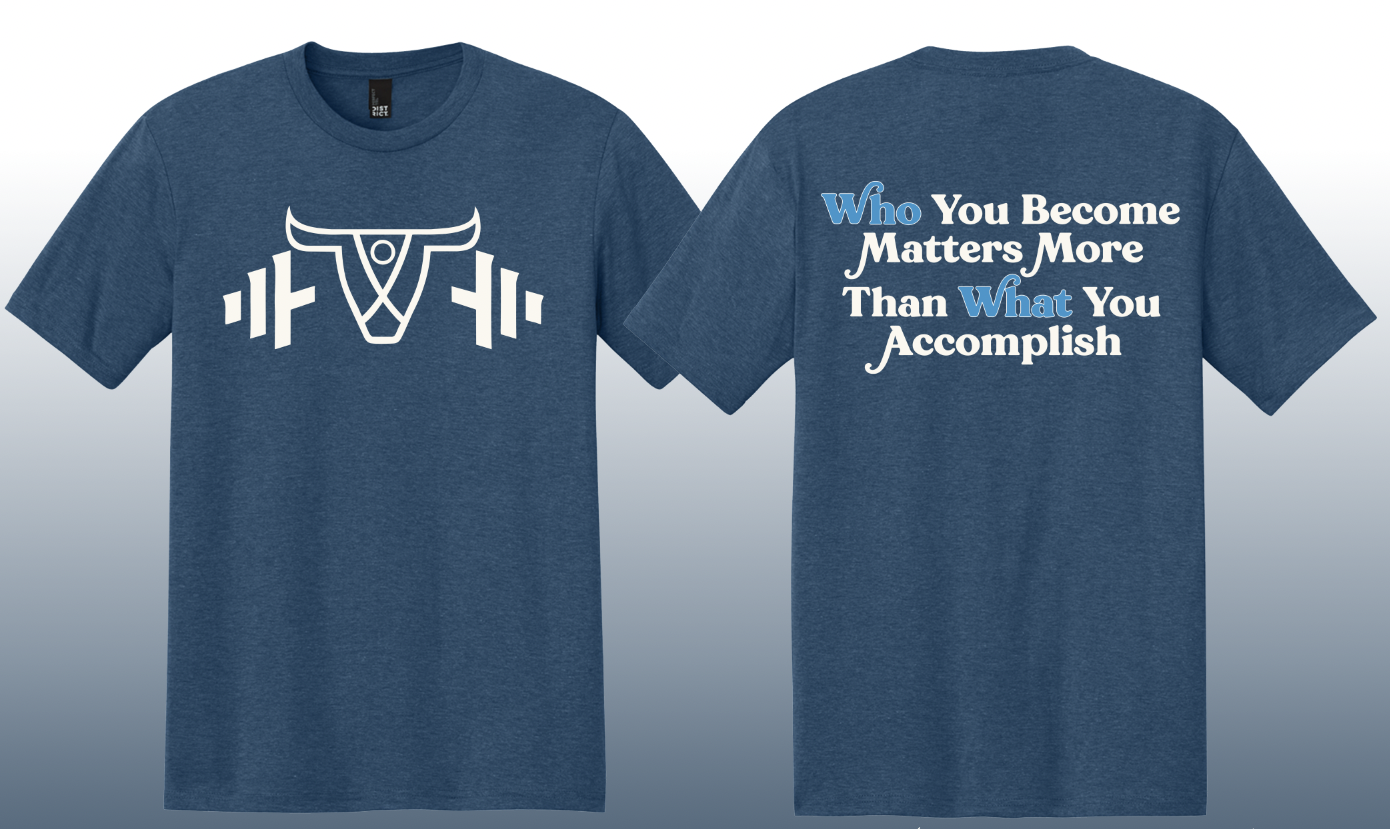 Choose from our Heather Neptune Blue Triblend T-Shirt ($20) or Heather Grey Sweatshirt ($30) with the Resolute ox & barbell design.